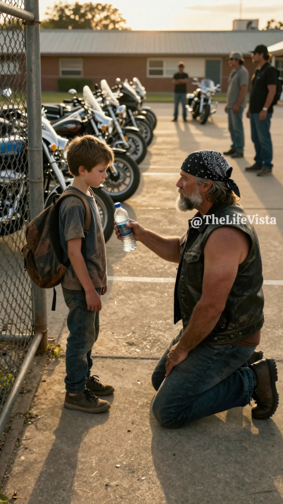 At the center of it stood Rowan “Gravel” Hensley, a man whose weathered face told a story written in sun, wind, and difficult decisions, his steel-gray hair pulled back, his eyes fixed on the school with an intensity that had nothing to do with spectacle. He had learned about Jonah through a chain of small observations, beginning when a rider stopped for water on Thursday and noticed a boy alone, dismissed it as a misunderstanding, then passed through again on Friday night and saw the same small figure curled near the door, at which point doubt hardened into certainty and certainty demanded action.