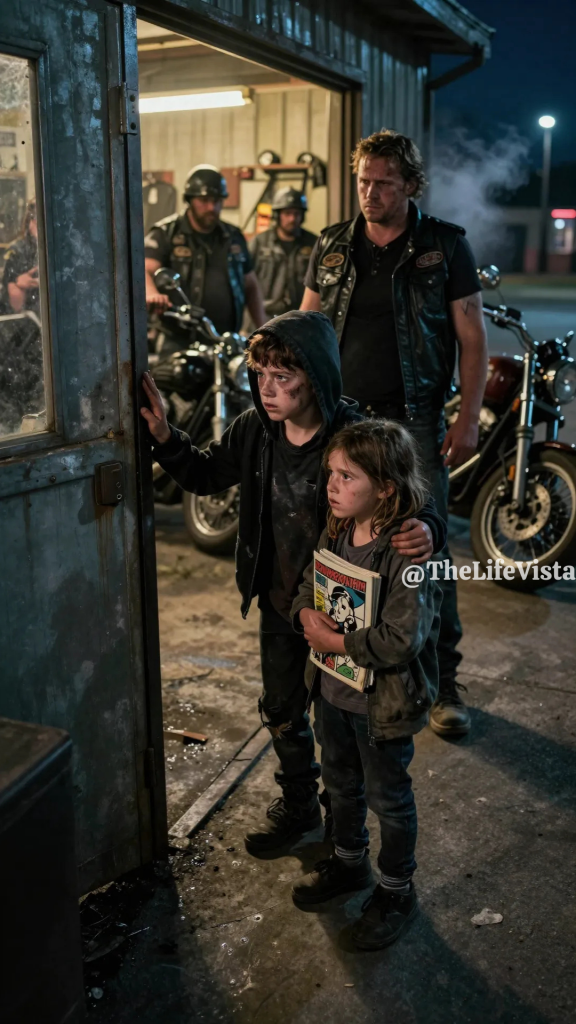 Gideon crossed the concrete floor and opened the door only a few inches, keeping his body angled and ready. A boy stood in the alley, fourteen at most, his hoodie torn at the sleeve, dirt streaked across his cheek, and his eyes carrying a weight far older than his face should have known. Just behind him stood a small girl, mostly hidden by shadow, clutching a worn paperback comic as though it were the last solid thing in the world.