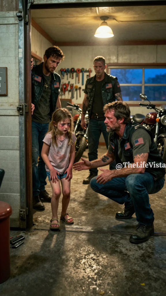 The man closest to her, a broad-shouldered mechanic known as Rowan “Forge” Hale, set the engine part aside with care that surprised even him, because years of fixing broken machines had taught him the difference between something bent and something truly damaged. The other three—Elias, Boone, and Calder—went still, their expressions hardening into something quieter and more d@ngerous than anger. The girl was seven, maybe eight, dark curls plastered to her cheeks with sweat, one sandal gone, the other barely hanging on, her oversized shirt hiding bruises that spoke louder than words ever could.