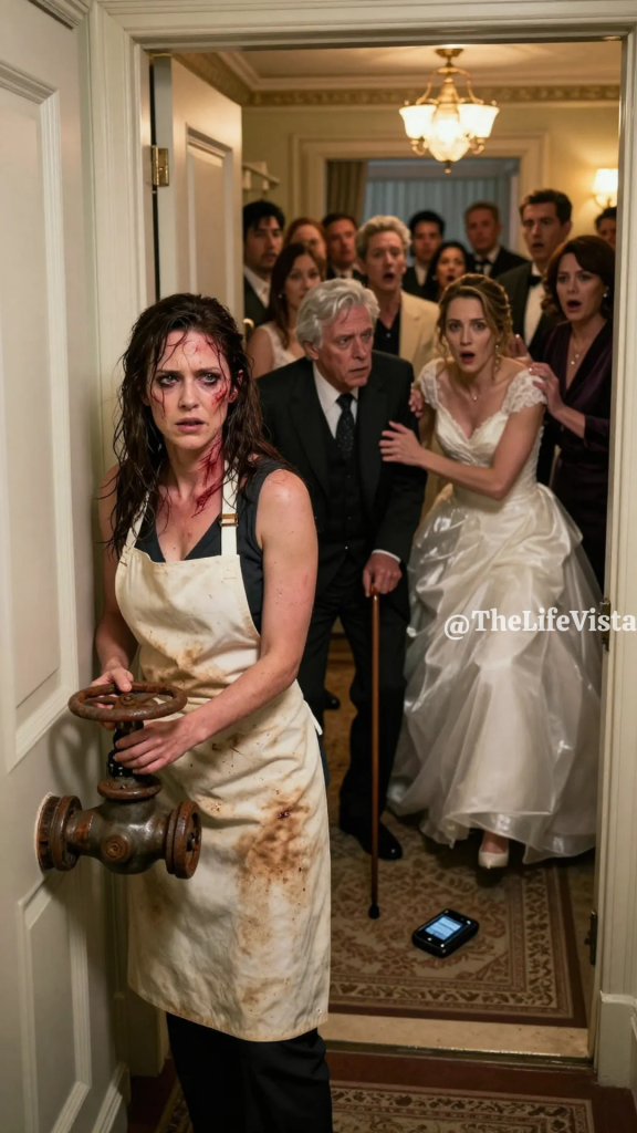 My flats squeaked on the polished floor as I ran toward the utility closet near the ballroom entrance. I yanked the door open and found the rusted valve wheel, its metal slick and stubborn. Using both hands, I cranked it hard, feeling muscles protest and old nerve damage flare, but I didn’t let go. The hiss of pressure d!ed, and the spray of water stopped, leaving only dripping and the sound of my own breath. I leaned my forehead against the cool doorframe for one steadying second. That was when the ballroom doors swung open behind me, letting music and laughter spill into the corridor like a tide.