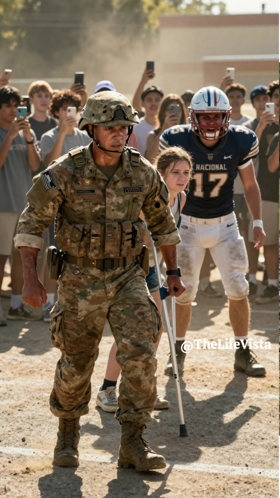 Lily was standing, struggling to maintain her balance on her crutches. Her backpack was on the ground, its contents spilling out into a puddle. And there, looming over her, was Brayden—the school’s golden boy. The quarterback. The one everyone adored.