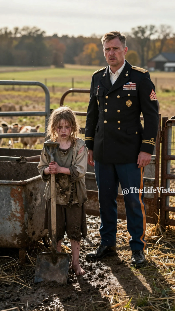 In the pigsty, barefoot and covered in mud, stood Lily. Her hair was tangled, her face pale, and her clothes were ragged, barely enough to shield her from the cool autumn air. She was bent over, her small hands trembling as she shoveled feed into a trough.