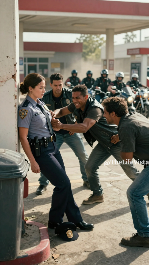 The station looked tired, sun-bleached signs and cracked concrete, a place that survived more on habit than profit. Lila stepped out of her patrol car and felt the glare bounce off her badge, the metal bright enough to sting her eyes. Behind the building, where the trash bins sat and the shadows gathered, five men lounged as if they owned the heat and the space. Their motorcycles were parked crooked, chrome catching light like teeth, and their laughter cut through the air with a mean edge that carried farther than it should have. She had met men like them before, the kind who mistook attention for power and a uniform for a dare. When one of them called out something ugly, she kept her face neutral and her pace steady, because reacting was what they wanted.
