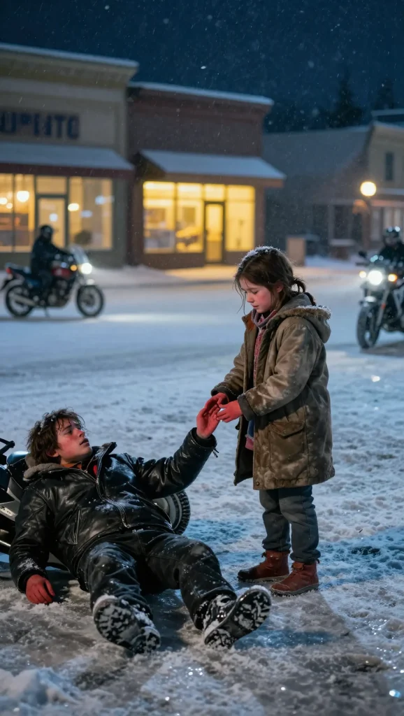 The man lay sprawled on the ice, large and wrapped in black leather, his breath sharp and uneven in the cold air. One gloved hand pressed against his chest while the other trembled uselessly against the pavement. A patch on his vest caught the light, the name Ridgeway Riders MC stitched boldly across it. In Pine Hollow, that name carried warnings, police reports, and rumors passed in lowered voices. None of it mattered now.