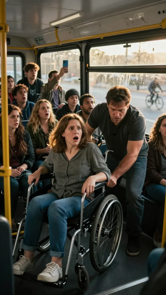 The afternoon began like countless others in the city of Brighton Falls, where buses followed familiar routes and strangers shared space without truly noticing one another. The vehicle eased through traffic under a pale sun, stopping and starting with the soft rhythm of a routine no one questioned. Near the center aisle, a woman in a wheelchair sat quietly, her hands folded and her gaze fixed on the window as storefronts slid past. Her name was Iris Caldwell, and she had grown accustomed to being overlooked in public spaces. What she had not learned to expect was how quickly invisibility could turn into unwanted attention.