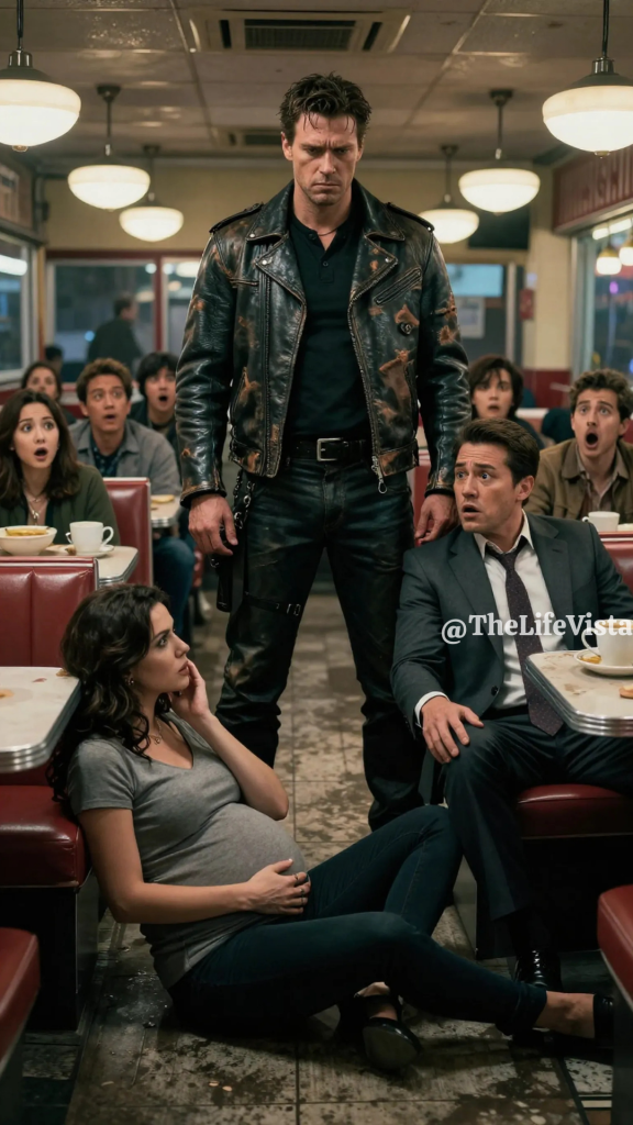 Before she could finish speaking, Daniel’s hand moved again. Fast and careless, it struck her across the face with enough force to send her stumbling sideways. She fell hard onto the floor, the sound of her body hitting the tiles slicing through the diner more sharply than any shout. The room went silent in a way that felt unnatural, as though even the air had chosen to stop moving.