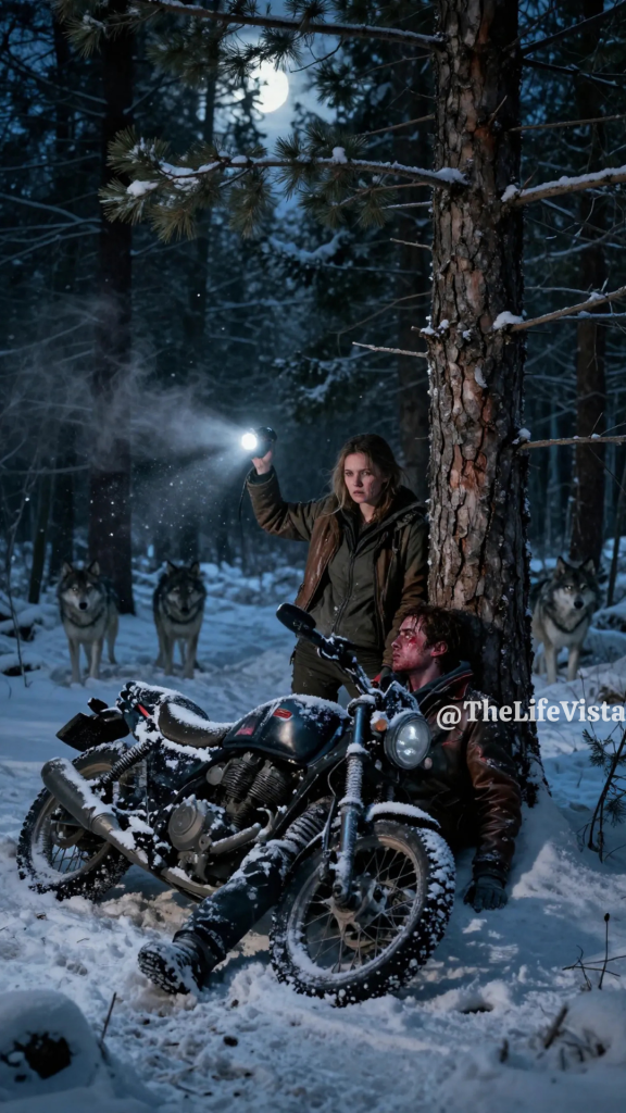 She followed where instinct led her until the flashlight landed on something that stole the air from her lungs. A motorcycle lay on its side, partially buried under snow and pine needles, its metal still ticking faintly from strain. A man was slumped against a tree nearby, barely upright, his body folded as if the forest itself had pressed him there. His jacket was torn, and dark stains marked the snow beneath him.