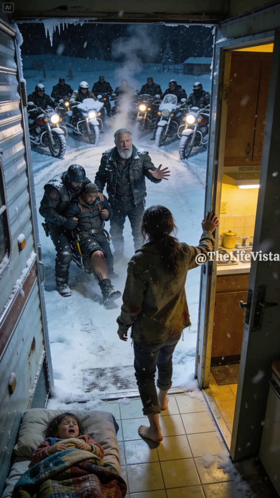 I crawled toward the door and lifted the cracked blind just enough to see shapes through the storm. Motorcycles stood in a line, large and dark against the white ground, their frames coated in snow. Men in leather jackets moved carefully, their helmets hiding their faces but not the tension in their posture. The first man stepped forward and removed his helmet, revealing a gray beard, a weathered face, and eyes that looked more exhausted than dangerous.