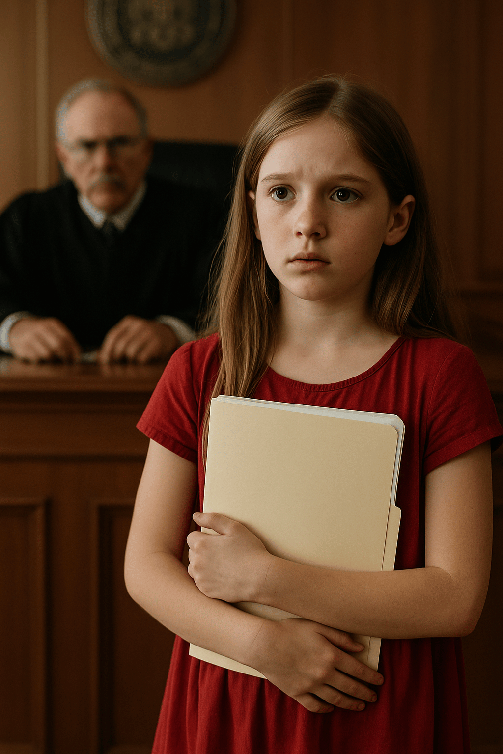 The courtroom fell dead silent. Every person stopped breathing as an 11-year-old girl with long brown hair walked toward the front. Her small shoes clicked against the wooden floor. She wore a simple red dress that was too big for her thin frame. In her trembling hands, she clutched a worn folder against her chest.