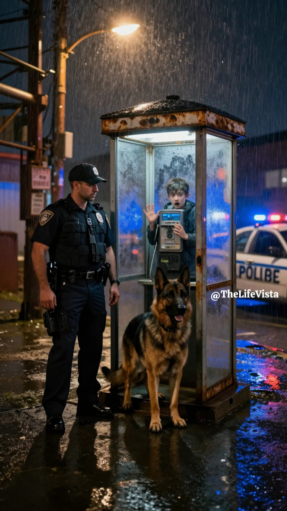 I radioed dispatch, killed the lights, and stepped into the rain. Cold water soaked through my jacket instantly, but my focus narrowed to the figure inside. A boy stood there, no older than nine, hoodie clinging to his thin frame. His hands gripped the receiver as if letting go would undo something fragile. Tears streamed down his face, mixing with rainwater.