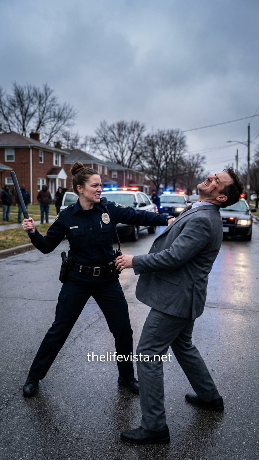 Her baton snapped into her hand. One sharp strike to his thigh forced him down to one knee. A second blow to his shoulder sent him pitching forward. Pain flickered across Andre’s face, but he still made no attempt to fight back. He lifted a hand instinctively—defensive, not aggressive.