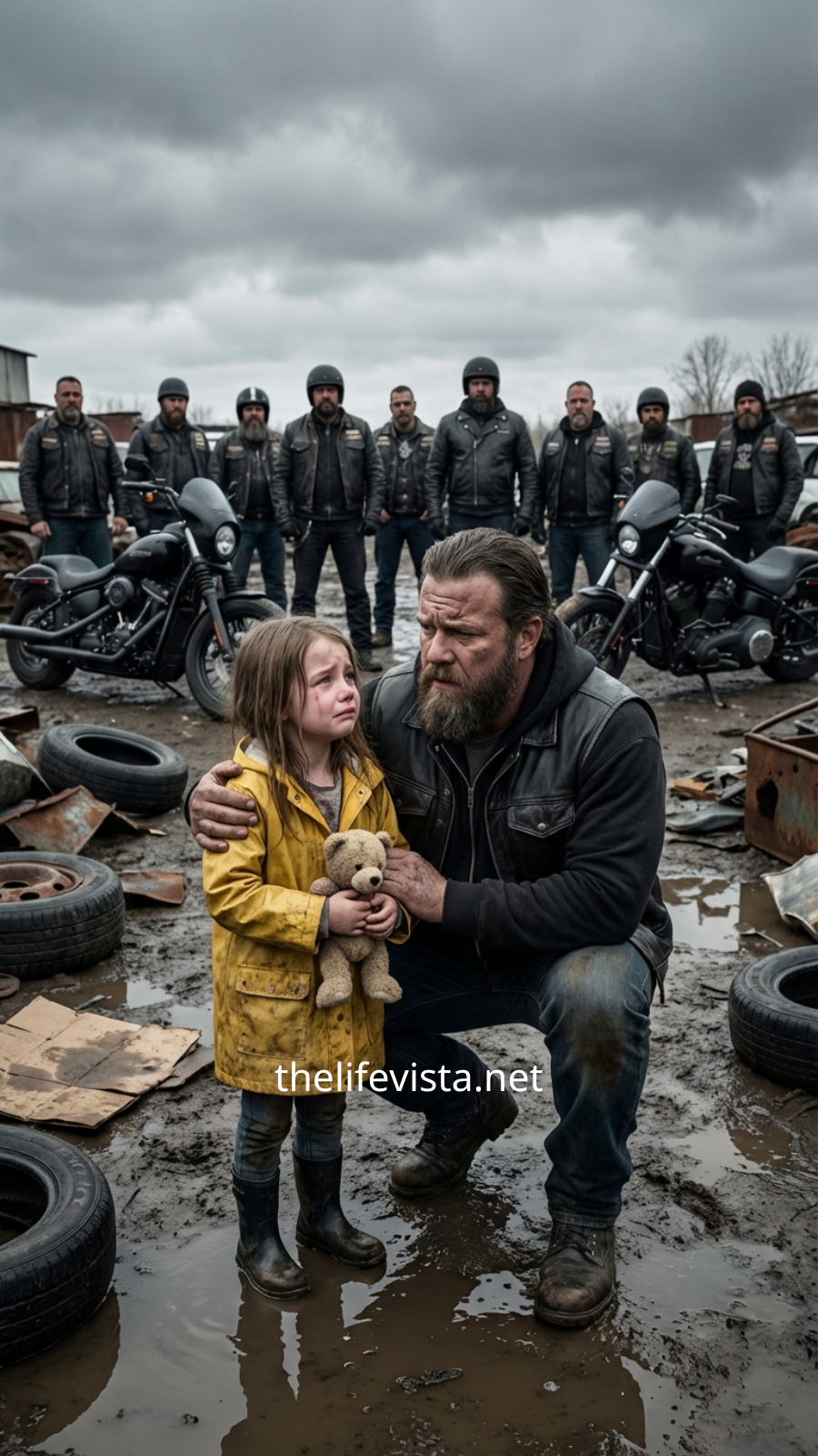 This one had been taken from much closer. It showed Garrett kneeling in the mud, lifting boxes with careful hands. It showed the riders standing shoulder to shoulder against the wind. It showed the moment he wrapped his vest around the girl and the way the entire group shifted from hardened road veterans into something gentler and far more human.