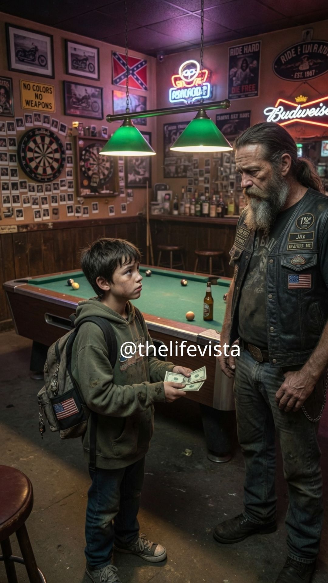 Jax found the kid at 5 AM, curled up behind the pool table with his backpack serving as a makeshift pillow. It was the third time that week the boy had broken into the clubhouse to sleep on the cold concrete floor. The kid couldn’t have been more than nine years old, with skinny arms, dirt under his fingernails, and shoes held together with layers of duct tape.