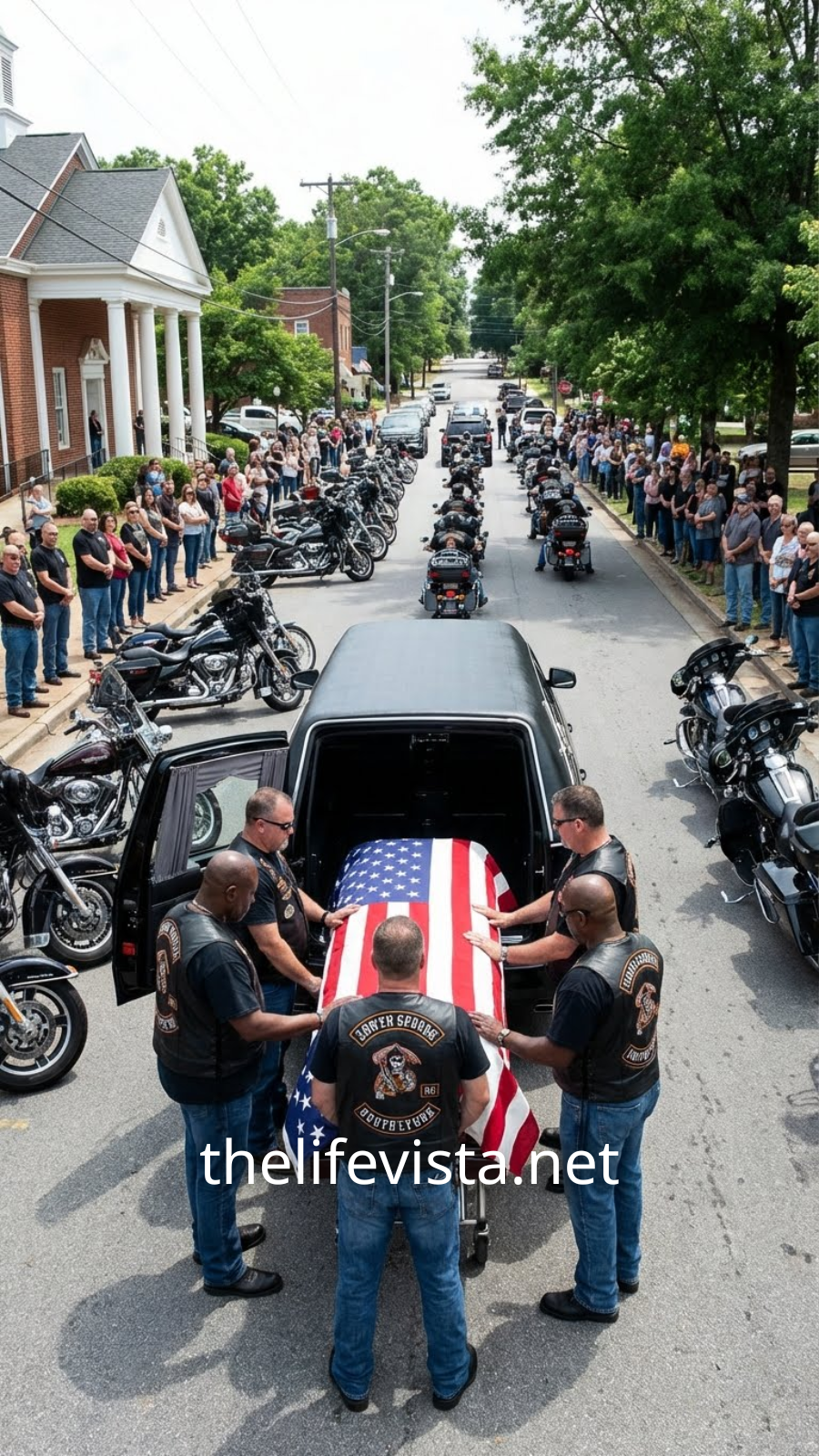 The bikers formed two long lines, engines off, standing shoulder to shoulder as the hearse rolled between them. When it reached the road, the engines started again—not roaring, not aggressive, but steady, unified, respectful.