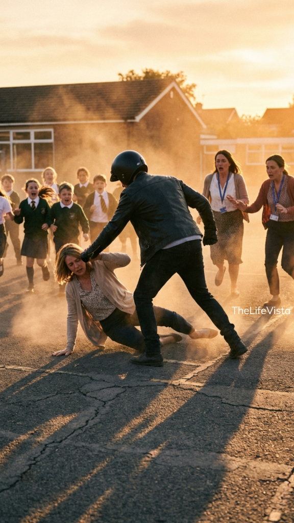The biker entered with precision, not reckless, not uncontrolled, but deliberate. He stopped near the blacktop, boots hitting the ground hard before the engine finally cut off. Heads turned. Students froze. Teachers stiffened.
