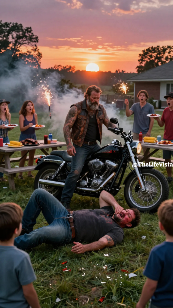 By the time the sun had begun lowering behind the trees and the smell of lighter fluid, grilled meat, and fireworks smoke had settled over the yard, my father was on his eighth beer and already moving into that dangerous stage where every small thing could become an excuse. My mother said something to him, and even now I could not tell you exactly what it was because the words themselves did not matter. It might have been about the food, about the cooler, about the children being too close to the firecrackers, or about nothing more serious than asking him to lower his voice. In our house the content rarely mattered. My father did not need a reason to become angry. He only needed the feeling that someone had inconvenienced his authority by existing too visibly. He reached for her arm with the quick hard movement that all of us recognized and none of us acknowledged. His hand closed just above her elbow, and I remember with horrible clarity the way her mouth opened on a sharp little gasp she tried to swallow before anyone could hear it. He squeezed hard enough that I saw her body tilt slightly toward him from the force. That grip was familiar to me even at eleven because I had seen its results. I had seen the long sleeves in July, the careful explanations, the bruises she hid while saying she had bumped into a doorframe or tripped over something in the laundry room. Around us, the entire family followed the old script. People looked away. A cousin suddenly became very interested in his hot dog. One aunt busied herself with stacking paper plates. My uncles stood still in the useless way men stand still when silence has become a family tradition. That was the rule in our family. You did not interfere. You pretended what was happening was not really happening. You told yourself it was between husband and wife and therefore somehow outside the reach of ordinary decency. The biker did not know our family’s rules, and that ignorance may have been the best thing that ever happened to us. He rose from his chair slowly, not with drunken bravado or theatrical fury, but with the deliberate calm of a man already decided. He walked across the yard without hurrying. My father saw him coming and snapped at him to mind his own business. The biker stopped close enough that there was no mistaking who his words were for and told him to let go of her arm. My father, still gripping her, turned his head and gave the challenge he must have expected to end the matter. He asked what would happen if he did not. The answer came in a single punch. It was not wild. It was not repeated. It was one clean, decisive strike delivered with a speed that seemed almost casual until my father dropped as if some unseen cord inside him had been cut. One second he was standing there swollen with alcohol and certainty, and the next he was in the grass holding his face while the whole yard froze around him.