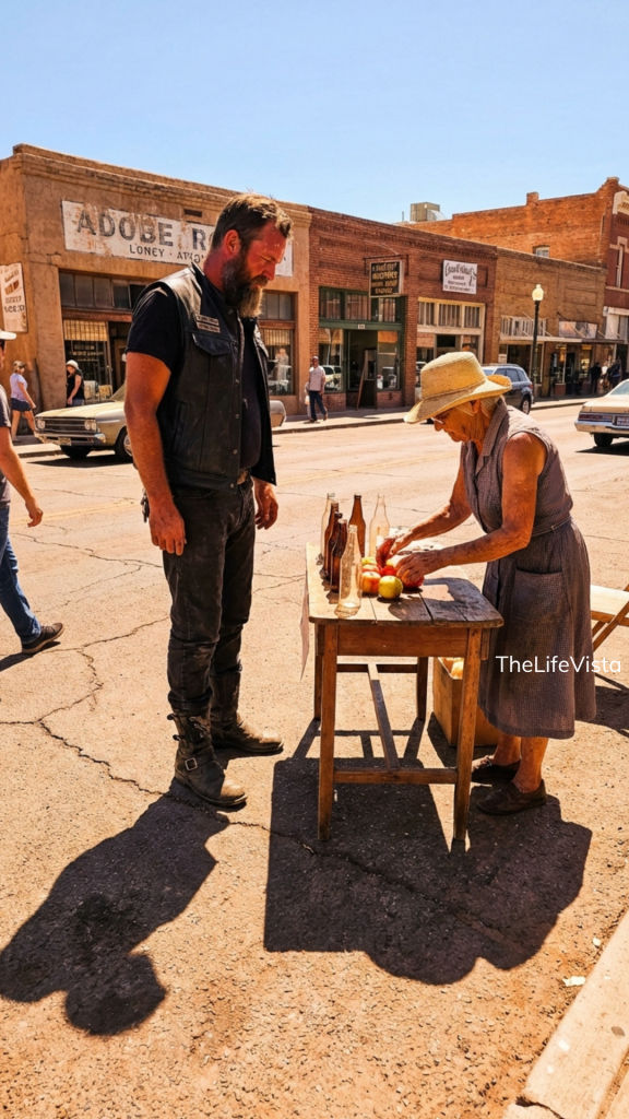 A man on a motorcycle, leather vest fitted snug against a broad chest, boots scuffed and worn. His helmet clutched under one arm, he scanned the scene silently. He didn’t approach her table to buy anything. He didn’t speak. He just stopped.