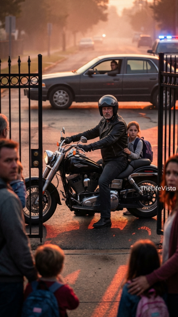 A single motorcycle cut through the calm. The engine hummed low and deliberate. Heads turned instinctively. A man on the bike pulled up directly in front of the school’s main gate. He didn’t park neatly. He stopped sideways, blocking the exit completely.