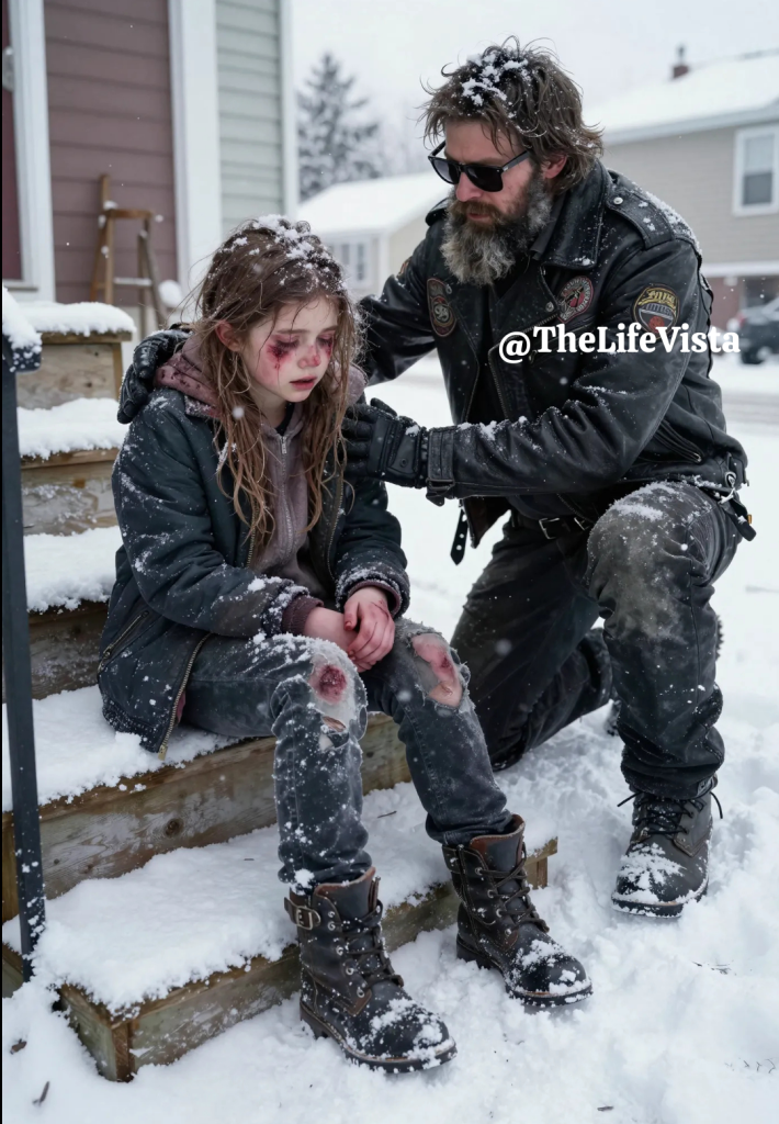 The winter wind screamed through the narrow streets, hurling snow into violent spirals that stung like needles against exposed skin. Marcus Hale pulled his leather jacket tighter around his broad shoulders, his boots crunching hard through the fresh powder as he walked back from Ray’s auto shop, already irritated by the cold that seemed to slip through every seam. The whole trip had been a waste of time anyway. They didn’t have the parts he needed for his Harley, and the mechanic had shrugged like it was nothing, like Marcus didn’t have a machine waiting at home that refused to stay dead. “Damn weather,” he muttered, breath billowing into pale clouds that vanished into the storm. His face, carved by years of hard living, was half-hidden behind the raised collar of his jacket, but the cold still found his cheeks and nose, burning them raw until even he had to blink against it.