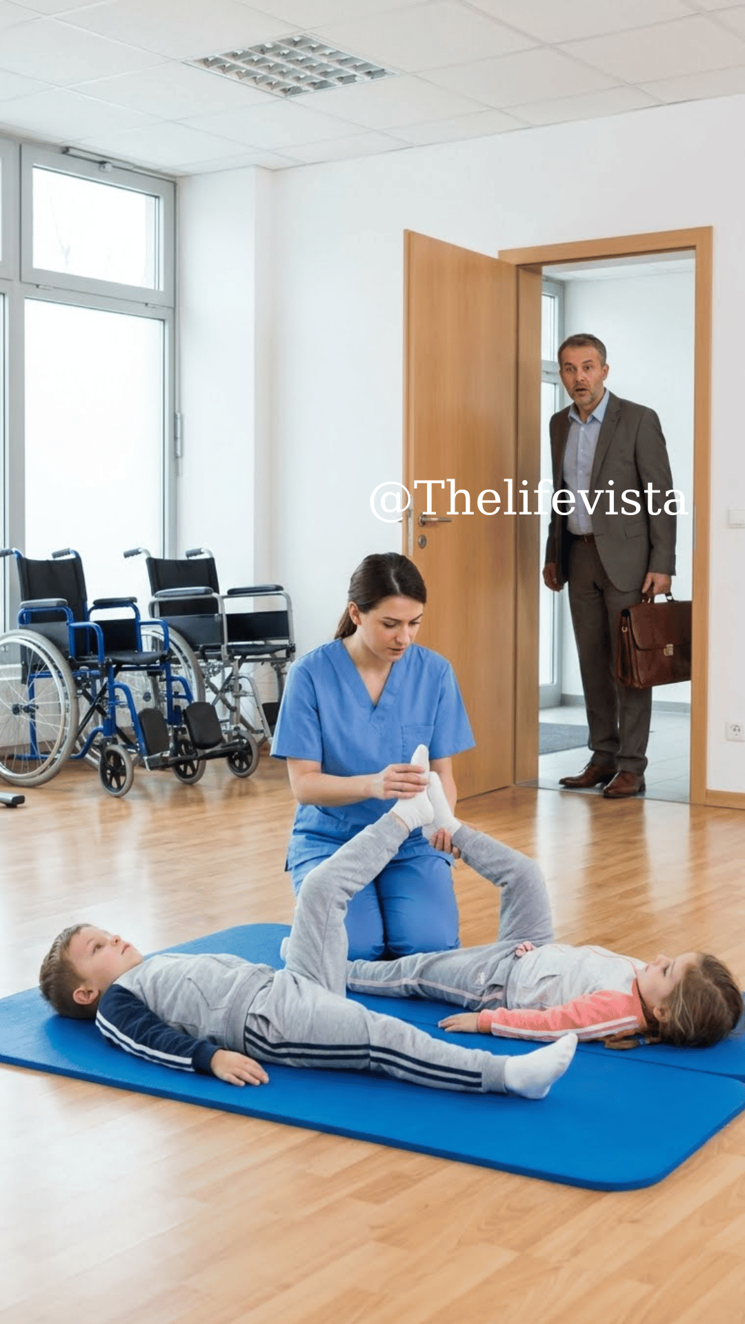 Daniel Carter stopped just inside the doorway of the therapy room, his body reacting before his mind could form a single coherent thought. His briefcase slipped from his hand and landed against the wall with a dull sound he barely registered. The wheelchairs that usually framed the space like silent sentries stood empty near the window, pushed aside as if they no longer belonged there. On the padded floor, his twin sons sat cross legged, their thin legs extended in front of them, while Emily Hayes knelt nearby, her hands resting lightly against their calves as she spoke to them in a voice so calm it felt almost unreal.