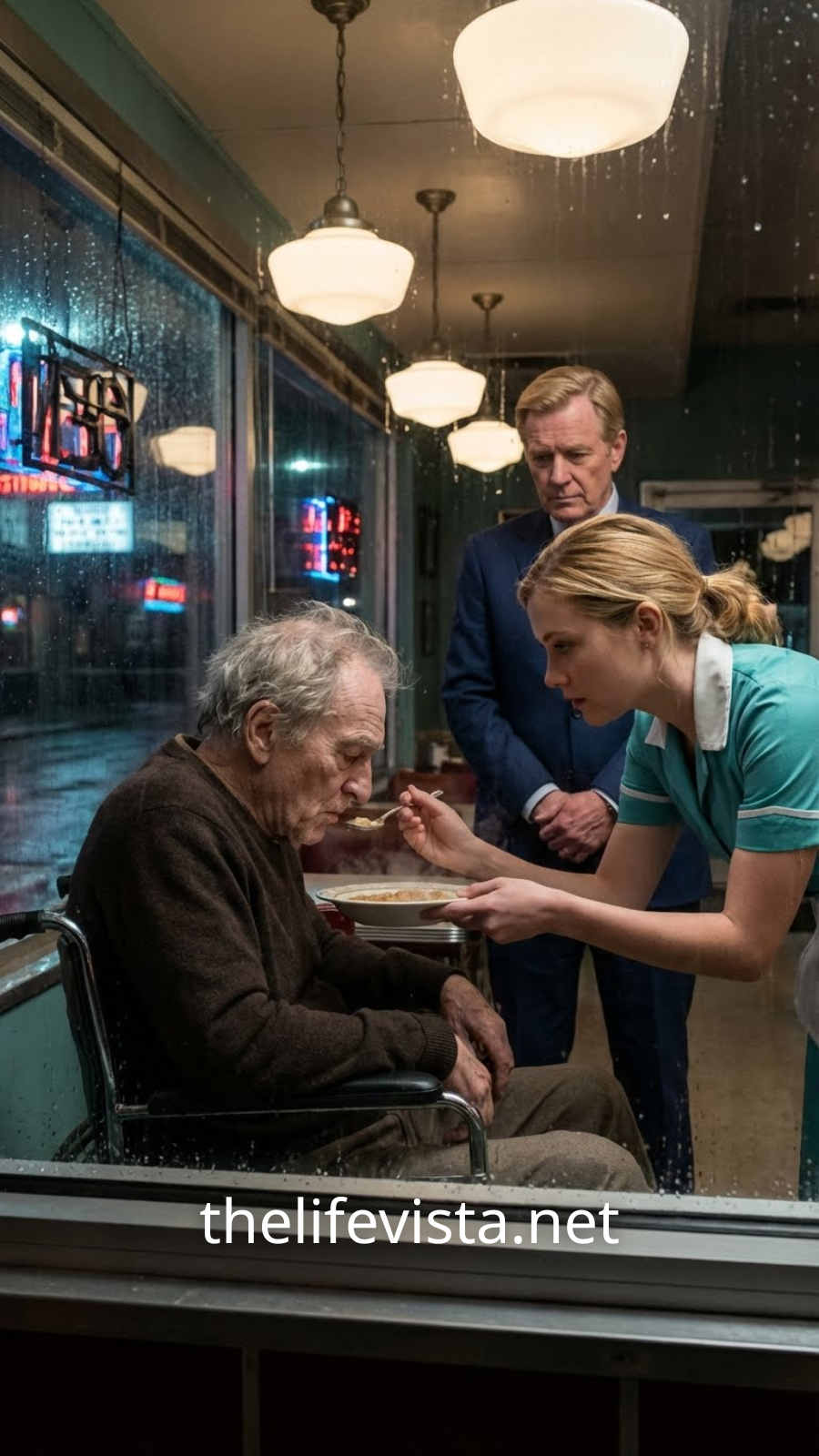 A waitress—young, worn down—feeding an elderly man in a wheelchair…