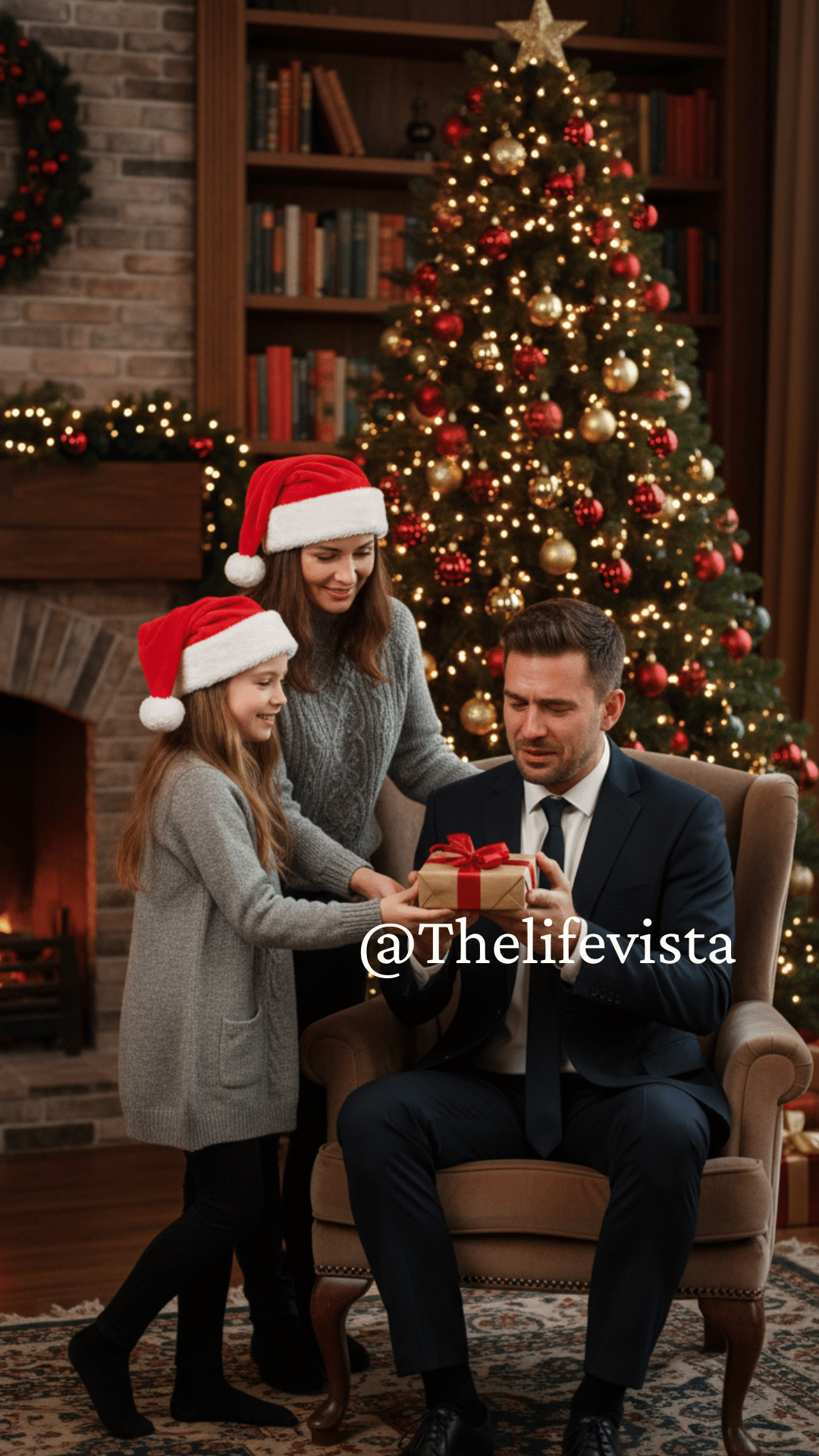 Christmas lights flickered softly through the window as the three of them stood together, a quiet family taking shape in the warm glow of an ordinary home