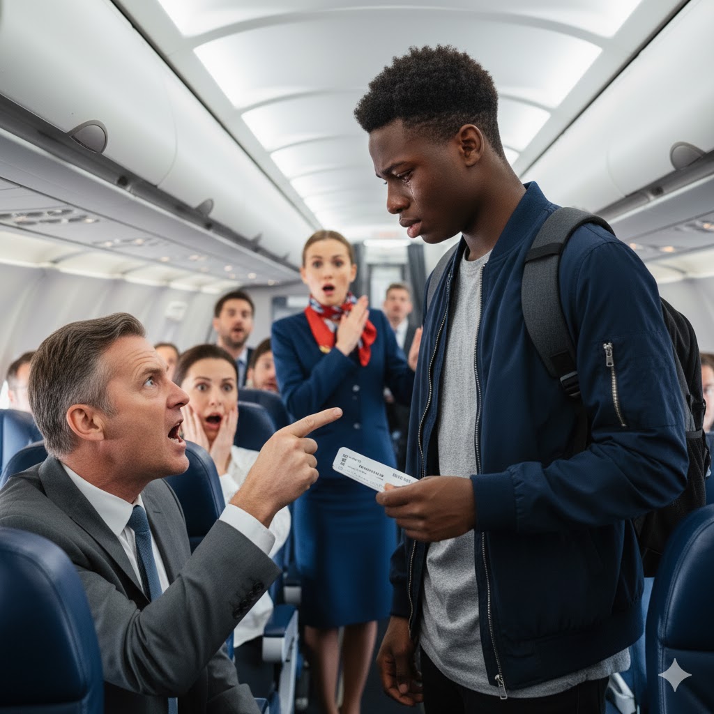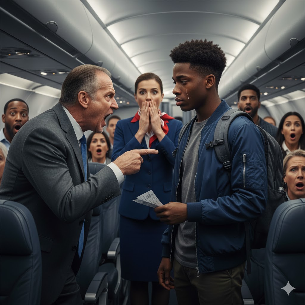 A tall man in a gray suit rose from his seat in 2B — Caleb’s seatmate. His tone was calm but commanding. “This young man belongs here. And so do I. You, sir, need to move — now.”