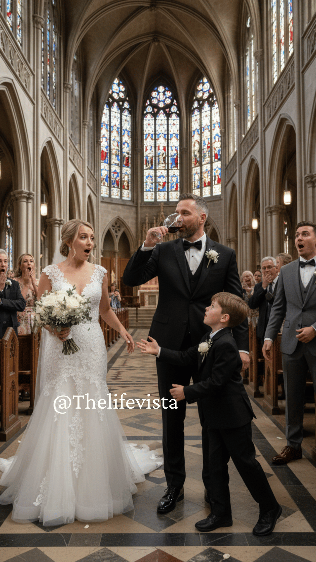 The church erupted in a storm of whispers. Guests craned their necks, confusion rippling through the pews. Graham froze with the glass halfway to his lips, staring at his son.