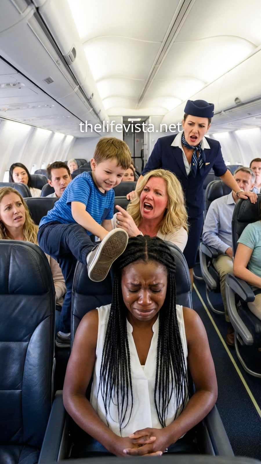 A young boy kept kicking the seat of a Black woman during a flight, giggling each time it jolted forward. But when the flight attendant politely asked him to stop, his mother snapped back angrily: “He’s just a kid! The real problem is that Black monkey complaining.” What happened afterward made both the mother and her son regret that moment for a long time.