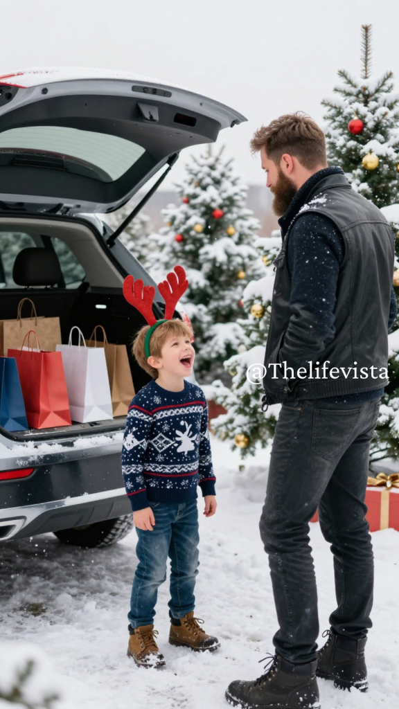 The man stood beside a black Harley-Davidson near the far row of parking spaces, loading groceries into leather saddlebags. He was tall. Broad. Solid. The kind of adult who looked like he belonged exactly where he was.