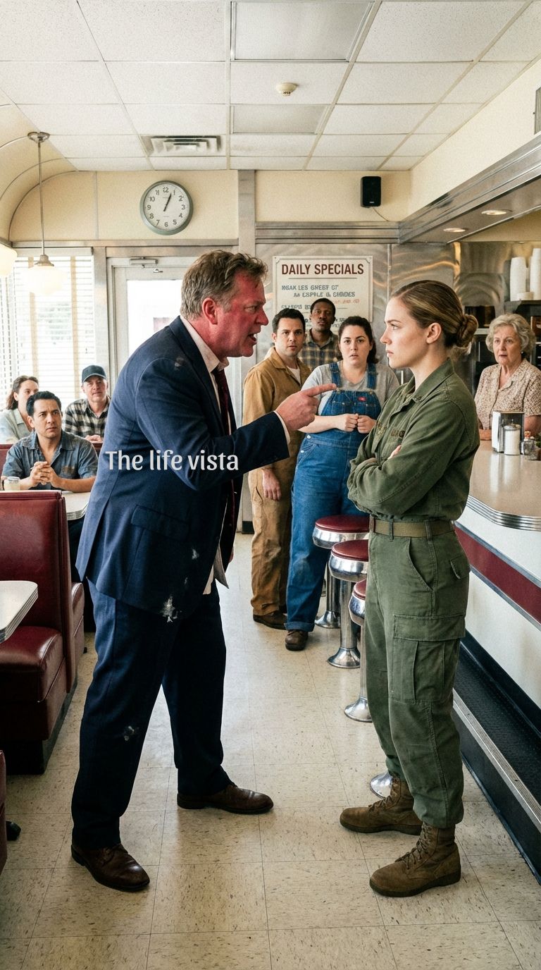 The heat from the spilled coffee still clung to the worn fabric of my boots as I straightened my uniform, brushing off crumbs of dust and sweat. These had been caked there from nine months in Afghanistan, a heavy reminder of the world I had just left behind. The interstate diner was dimly lit, a flickering neon sign humming like a distant generator, while the smell of burnt syrup did nothing to calm my exhaustion.