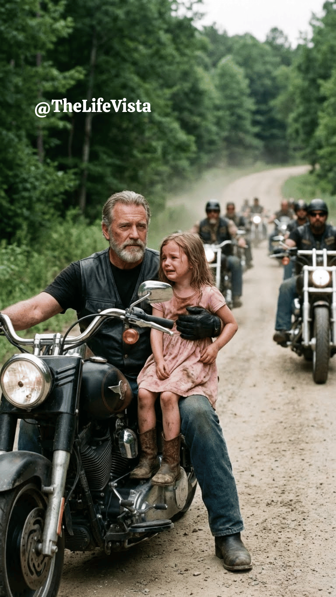 They found her running barefoot down the empty country road, her pink dress caked with mud and her voice breaking through the quiet forest like a cracked bell. Her tiny hands shook violently as she chased the roaring motorcycles, her breath shredding against her ribs. The words she screamed were enough to freeze the blood of even the hardest men riding that day.