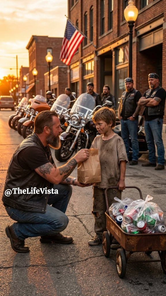 Fear locked his legs in place. He had learned early that groups of men rarely meant anything good in his neighborhood. The lead bike slowed and stopped several feet away, and the rider dismounted calmly, removing his helmet. He was a large man with gray in his beard and eyes that carried a quiet kindness beneath the leather and patches. He asked if Marcus Hale was his name. Marcus didn’t answer, gripping the wagon handle until his knuckles whitened. The man raised a hand and told him he wasn’t there to cause trouble, introduced himself as Toro, and gestured toward the motorcycles behind him, explaining that they had heard about him. When Marcus asked what they could possibly have heard, Toro crouched down until they were eye level and told him they knew about a ten-year-old who worked every Saturday so his mother wouldn’t go hungry. Marcus flushed with embarrassment and muttered that it wasn’t a big deal. Toro shook his head and told him gently but firmly that it was.