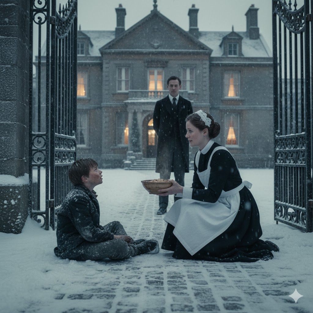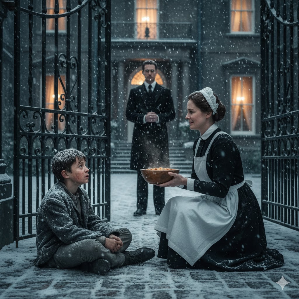 A boy. Barefoot, his face smudged with dirt, his arms wrapped tightly around his bony chest as he trembled from the autumn chill. His hollow eyes were fixed on the grand front door as if it might open to salvation. Emma’s heart clenched.