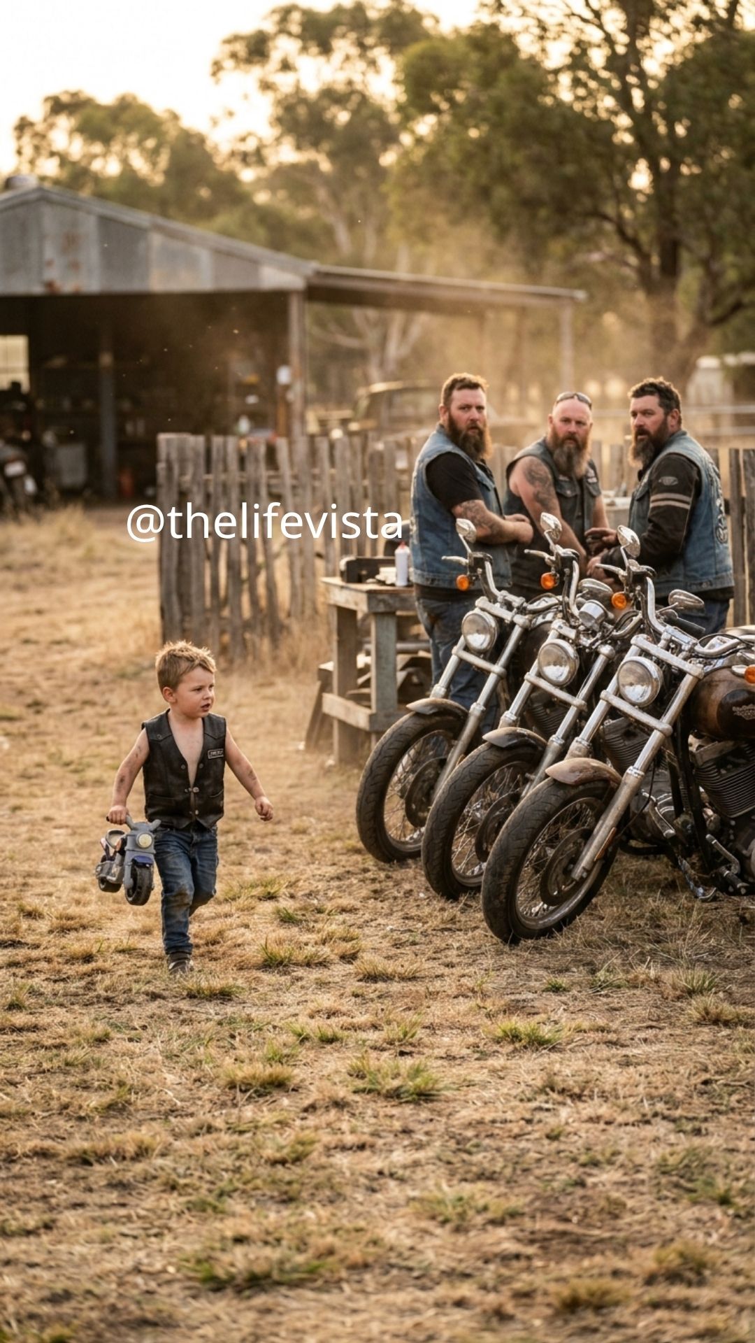 The yard was quiet except for the sound of a child crying, a fragile noise that didn’t belong in a place filled with hardened men and heavy machines. Grass bent under small running feet as the boy rushed forward, the evening air carrying his desperation across the open space. Motorcycles stood lined up beside the wooden fence, dark and still, like silent witnesses to something none of them expected to see.