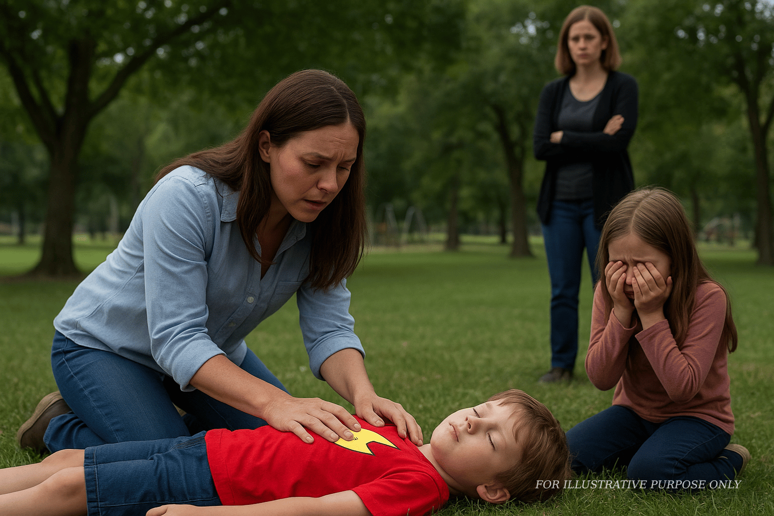 Her face was blotched with tears, her hands shaking as she clutched Caleb’s limp form. He was lying on the grass, pale and still. I ran to them, my chest heavy with dread.
