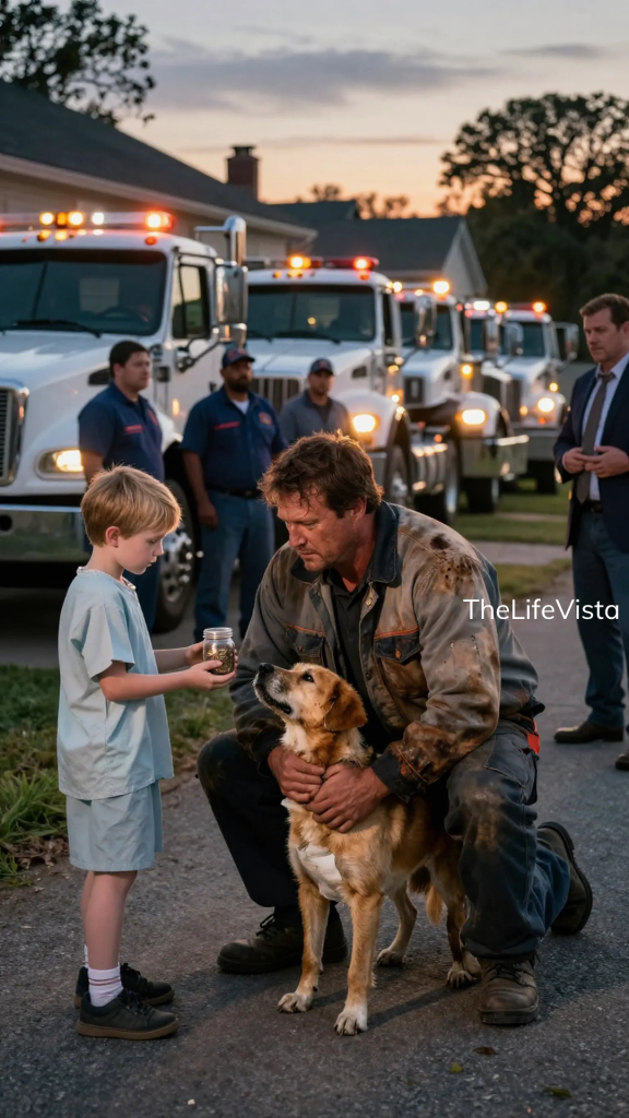 That last part stopped me for a beat, and I asked him how he knew anything about my yard. For the first time, the corner of his mouth moved in something like a smile. He said I had towed a neighbor’s car the previous summer and that he had watched me from across the street. Children notice things the rest of us step past without a glance, and in that moment I understood that he had been carrying this plan in his head for longer than I wanted to imagine. I looked at the pennies, then at the collar, then at the dog whose wary eyes never fully left my face, and then back to Owen. Something settled inside me with an awful clarity. I slid the jar gently back toward him, took the red collar instead, and tucked it into my pocket.