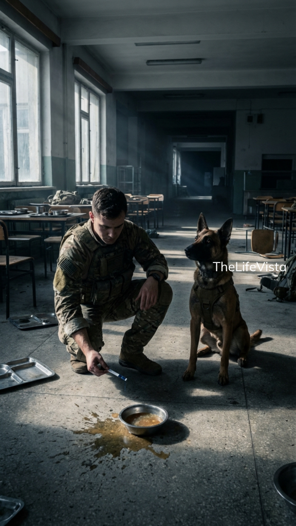 His name was Rook, a Belgian Malinois assigned to base security. He was known for his restraint. No wasted motion, no false alarms. He lay under a nearby table while his handler ate, almost invisible. Then he lifted his head. Ears forward. Body tight.