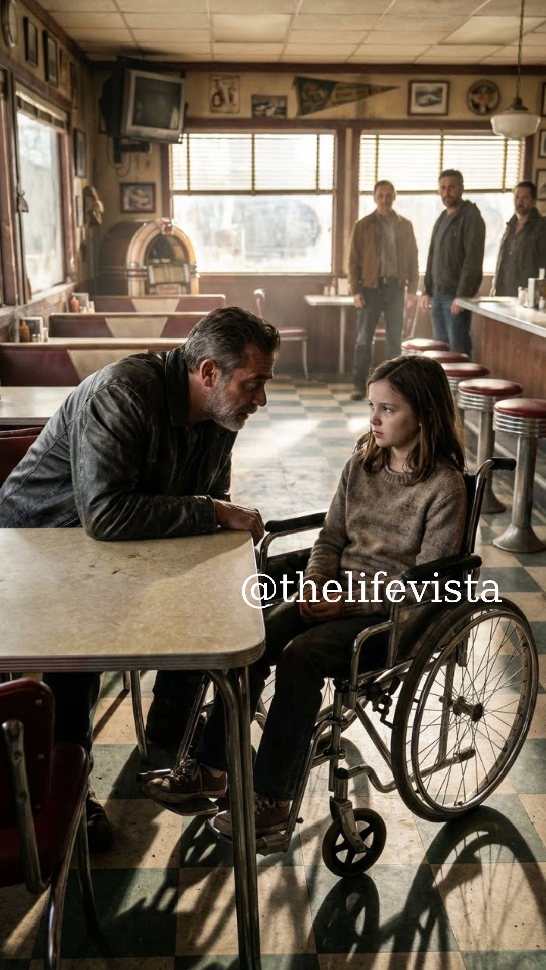 The girl sat near the window in a wheelchair, her small legs tucked under a faded blue blanket. Her name was Lily. Her pancakes sat untouched, syrup cooling, butter melting into nothing. A blue ribbon held her hair back neatly, like she was trying very hard to be brave.