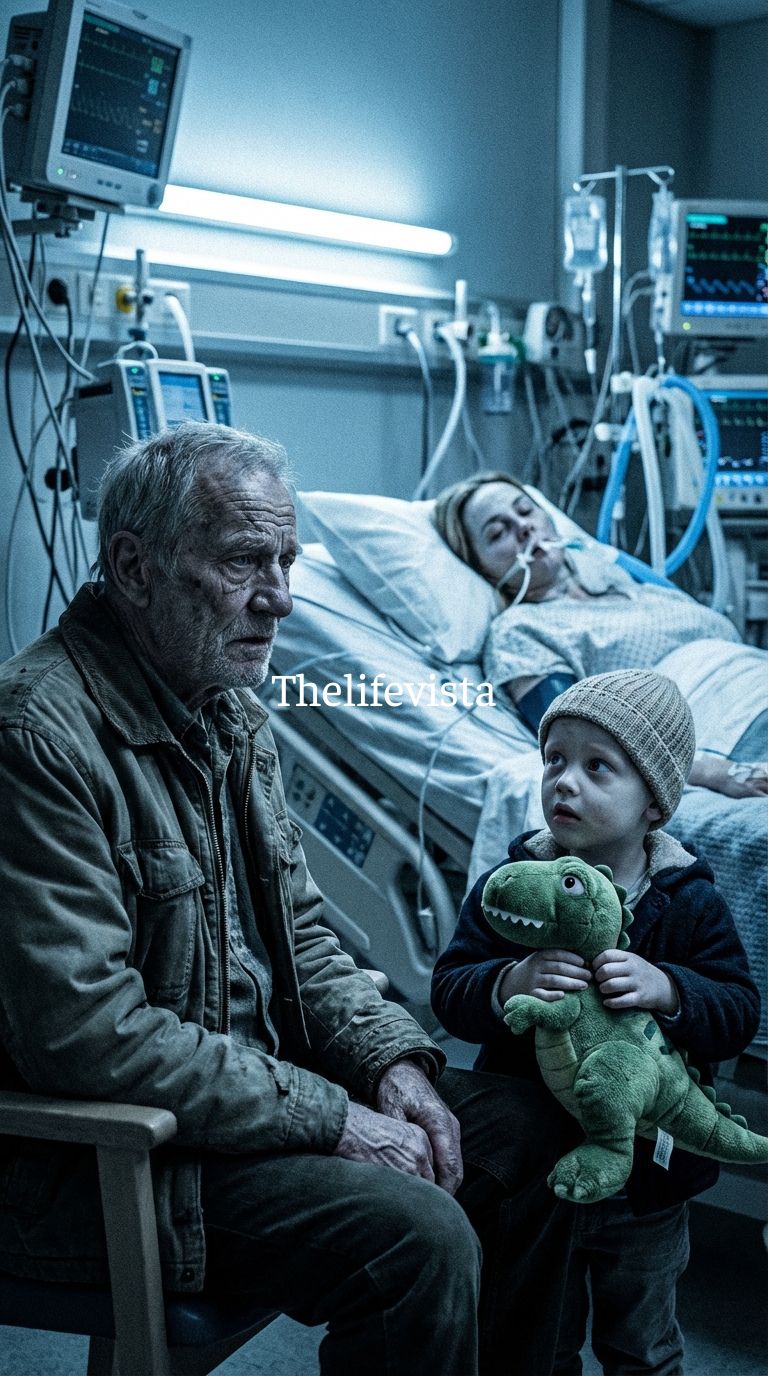 A small boy sat in a plastic chair beside the bed, legs too short to reach the floor, clutching a worn stuffed dinosaur in one hand while the other held his mother’s limp fingers with fierce determination, and when he looked up at the unfamiliar man entering the room, his eyes were not frightened but searching.
