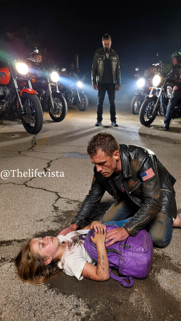Three bikers stopped at an abandoned lot after a territory fight. Engine still hot, knuckles still bloody. That’s when they heard whimpering behind a wrecked car, a barefoot 10-year-old girl clutching a purple backpack. When the lead biker checked her bag, his blood ran cold.