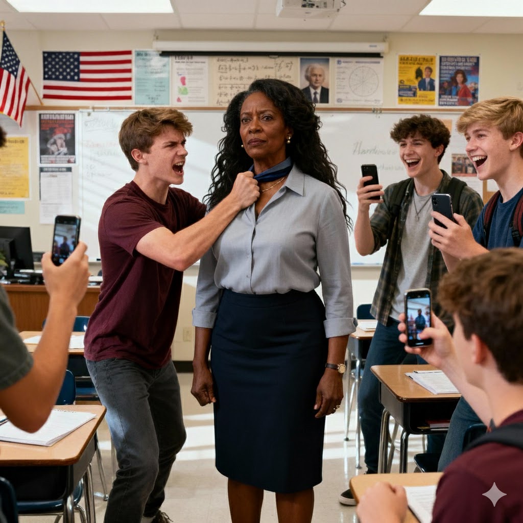 A group of racist students grabbed a Black teacher by the collar and insulted her in class — not knowing she was a former Navy veteran with a fierce reputation….