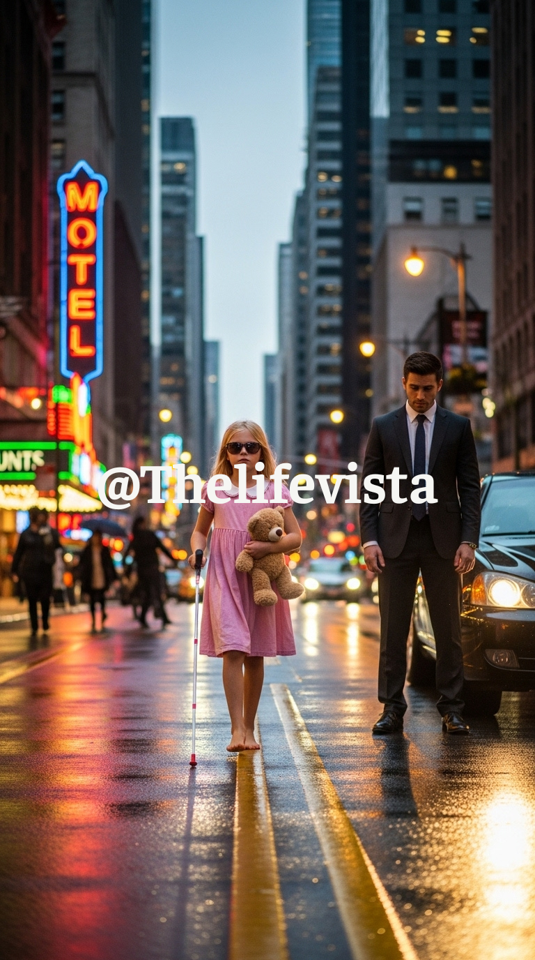 Some slowed down, confused, but kept walking. The city had grown used to ignoring things that looked like problems. Sarah’s small body shook. Her stomach hurt from hunger. Her feet were sore and swollen. Her cane dragged more than tapped. She was too tired to lift it properly. She whispered the lullaby her mother always sang.