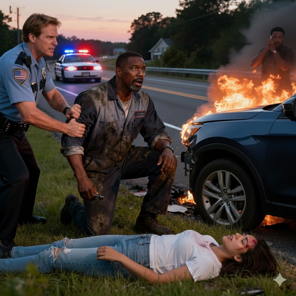 Derrick raised his hands. “I just pulled her out! The car’s about to catch fire!”