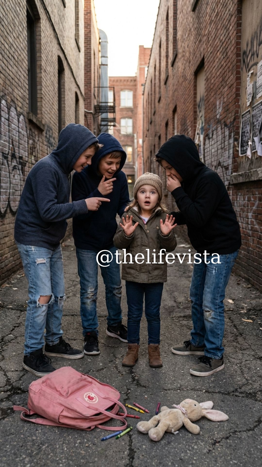 A little girl, maybe seven years old, backed against the brick wall near the loading area. Her pink backpack lay open on the ground, its zipper split, crayons scattered like broken promises across the concrete. A small stuffed rabbit lay face-down in the dirt. Two older boys stood in front of her, blocking the narrow path out, their laughter low and cruel in a way Caleb recognized immediately.
