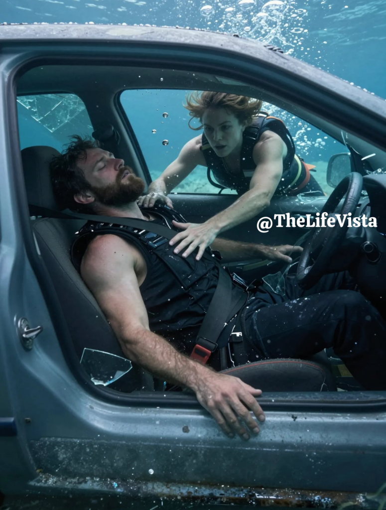 The world spun. Sound collapsed into a dull underwater roar. He tried to move, tried to breathe, but icy water was already pouring in, rushing up his legs, his chest, stealing the air from his lungs. He reached for the door. It wouldn’t budge. The guardrail had crushed the frame on impact, pinning him inside.