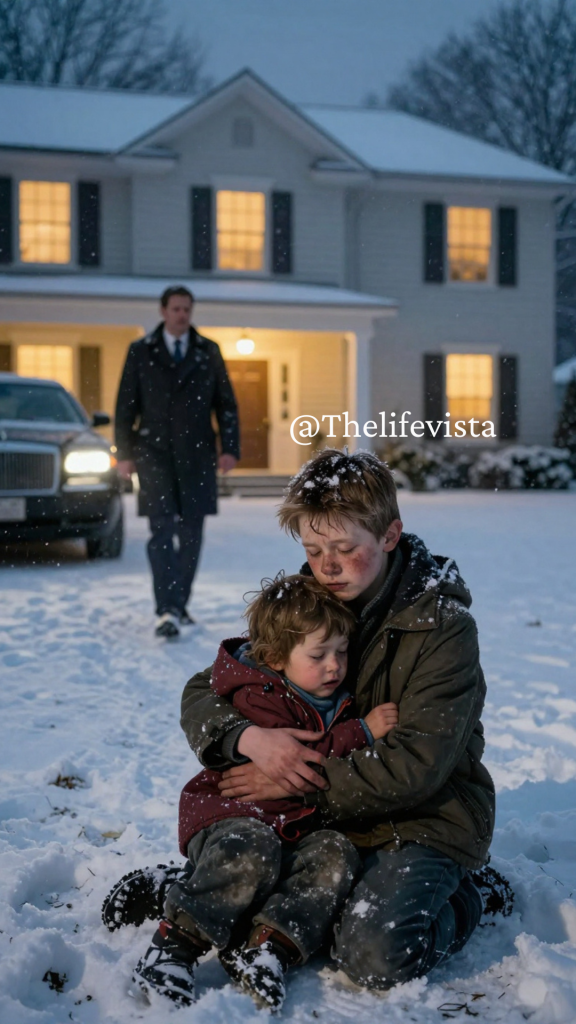 Beyond a towering black iron gate, a little girl sat curled on the front steps of a massive mansion. She wore thin pink pajamas printed with cartoon stars. No shoes. No coat. Snow dusted her hair as her body shook violently.