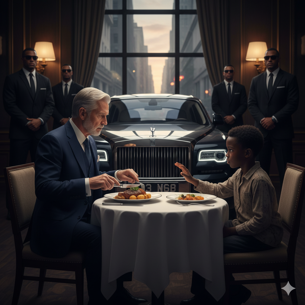 Security rushed forward, grabbing the boy by the arm. “Sir, he’s a street kid. Probably begging—”