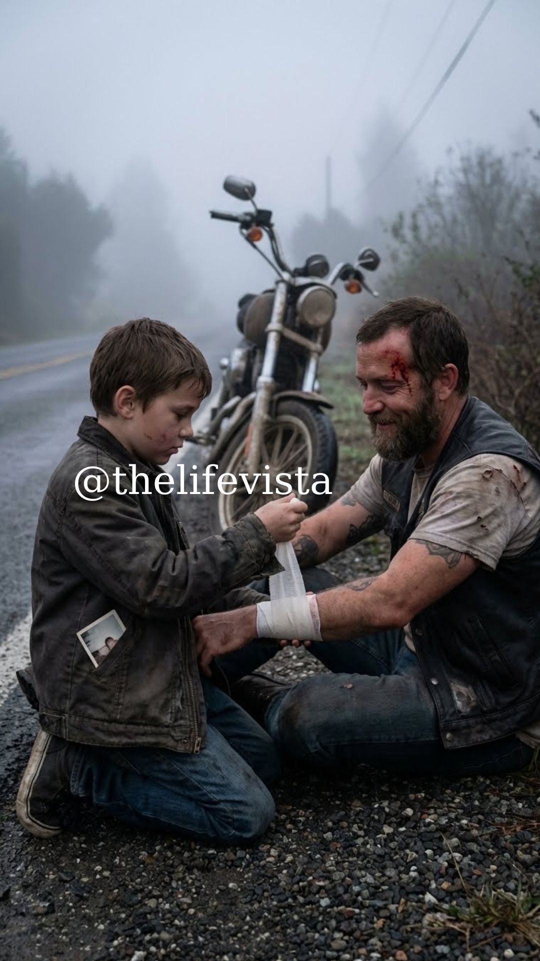 Then he hears it—a low, metallic groan, muffled yet distinct, coming from the side of the road. Instinct screams at him to run, yet something deeper—some buried fragment of decency, some fragile spark of courage—pulls him forward. There, half-hidden by fog and leaning awkwardly against a ditch, is a man bleeding from his shoulder, his leather jacket torn and dark with blood. Nearby, a motorcycle lies on its side, chrome glinting in the muted morning light. Ethan’s pulse quickens; every instinct tells him this man is dangerous. But leaving him to die isn’t an option.