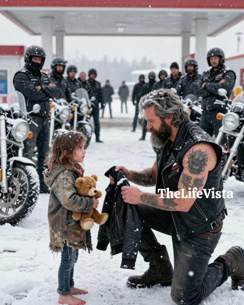 While the wind shoved hard against the glass doors and the fluorescent lights buzzed overhead, the girl tried to be invisible, listening to the sound of engines and men’s laughter on the other side of the wall, and inside the station the smell of burned coffee and gasoline mixed in that lonely way only highway places manage, because at the counter an old biker everyone called Grizzly stood with his breath fogging in the cold as his black leather sleeveless vest hung open over a faded thermal shirt, and the patch across his back marked him as part of the Iron Serpents, a stylized phoenix wrapped around an iron cross, while full-sleeve tattoos wrapped both arms and a skull inked deep into his bicep ached in the winter air.